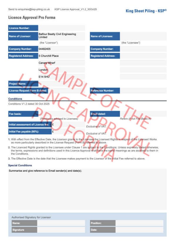 For permission to use KSP® on a project without infringing Balfour Beatty plc’s Intellectual Property rights under Section 60 of the Patents Act 1977, the following is required: