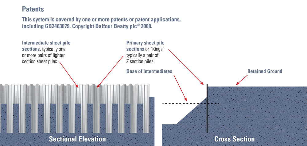 The simplest and most efficient form of KSP wall consists of pairs of crimped Z piles as kings, with pairs of the lightest practicable Z piles, as intermediates.